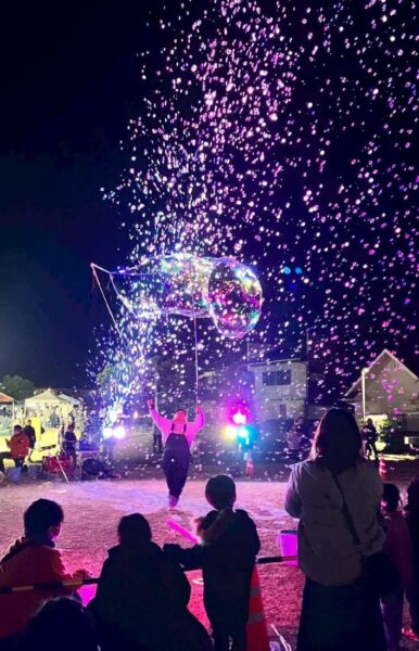 また、🫧シャボン玉パフォーマーのステージでは、夜空いっぱいに舞うシャボン玉とキャンドルの光が重なり、